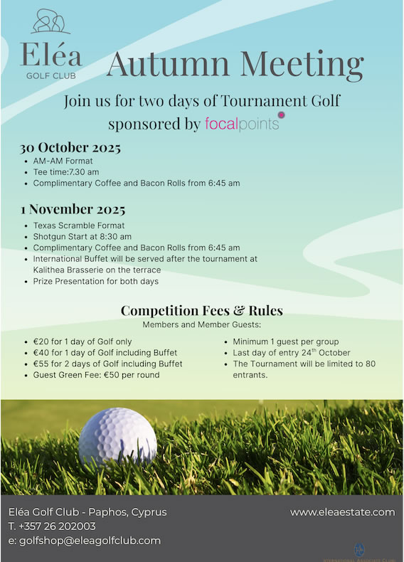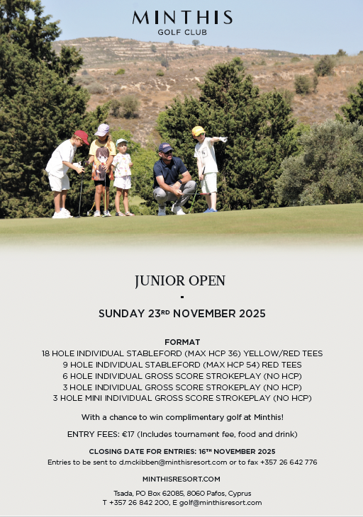 Cyprus Golf Federation's premier Junior tournament (a WAGR counting event) to be played on the Eléa Golf Course, from 16 to 18 February 2026 (Registration & Official Practice Round - 15 February). Eligible to compete in the U16 category are boys and girls who as of January 1, 2026 are 16 years old or under and with a maximum WHS HI of 28.0 for boys and 36.0 for girls.